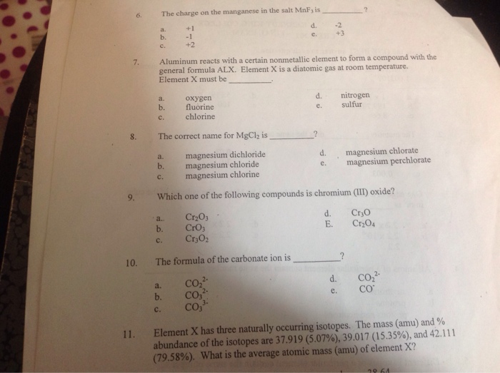 The charge on the manganese in the salt MnCl 3 is A 1 B 1 C 2 D 2 E 3 40Chromium The charge on the manganese in the salt mncl 3 is a 1 School Haji. Add your answer and earn points. Common Cations and Anions Name Formula Charge Name Formula Charge Name Formula Charge aluminum Al 3 3 magnesium Mg 2 2 carbonate CO 3 2 2 ammonium NH 4 1 manganese II Mn 2 2 chlorate ClO 3 1 barium Ba 2 2 manganese III Mn 3 3 chloride Cl 1 cadmium Cd 2 2 mercury I.